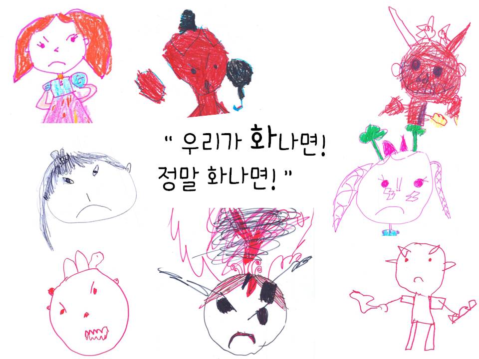 -나는 화가나면 화산폭발 하는 것처럼 머리에서 불꽃이 나올 것 같아. -나는 화가나면 입에서 불이 나올 것 같은데! 그래서 나쁜 말도 나와. -나는 화가나면 얼굴이 빨갛게 변하고 눈이랑 코도 커진다! -나는 화가나면 눈이 위로 올라가고 도깨비처럼 머리에 뿔이 나지!
