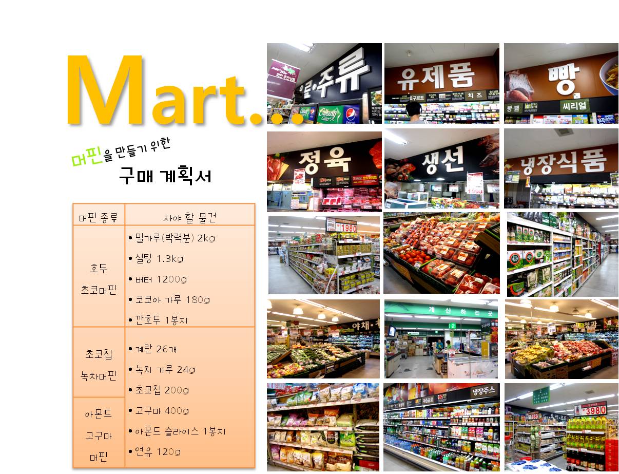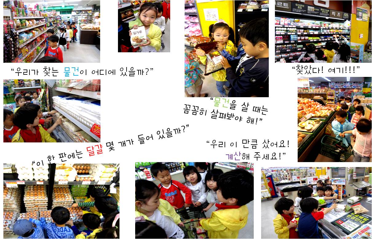 머핀의 종류에 따라 두 팀으로 나눈 후, 머핀을 만들 때 필요한 재료 목록을 적어 마트에 방문합니다. 어린이들은 사야할 구매서를 확인하며 마트에서 필요한 재료가 있는 곳을 찾아봅니다. “어? 위에 있는 팻말에 밀가루, 설탕이라고 적혀 있어요! 저쪽으로 가보면 되겠어요!” “박력분이라고 적혀 있는 밀가루가 어디에 있지?” “찾았다! 여기에 있어!” “버터는 우유랑 치즈 파는데 있었던 것 같아.” “저기에 버터라고 적혀 있어!” “고구마는 어디에 있지?” "채소 파는데 가면 있을 거야.“ “달걀은 26개가 필요한데... 이 판에는 몇 개가 들어 있는거지?” “하나, 둘, 셋..... 25개? 26개?, 30개?” “30개가 들어있네.” “달걀은 이 한판을 사면 되겠다!” “녹차가루가 안 보여. 우리 계산하는 아줌마한테 물어보자!” 어린이들은 필요한 재료를 구매한 후 계산을 합니다.