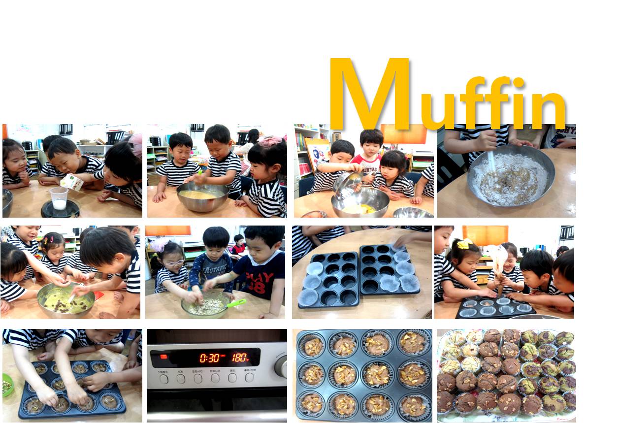 “앞에 우리가 산 물건 가격이 찍힌다!” “영수증에는 우리가 산 물건이 찍혀 있어!” “우리가 필요한 것들을 적어 와서 사야할 물건들을 잊어버리지 않고 다 살 수 있었어.” 어린이들은 살 물건에 대한 계획을 세우고 재료를 구매해 봄으로써 계획성 있는 소비를 할 수 있었을 뿐만 아니라 물건을 살 때 고려해야 할 점(유통기한, 가격, 양)들에 대해서도 생각해 볼 수 있었답니다. 머핀을 만드는 방법에 대해 알아본 후 구매한 재료를 이용해 머핀을 만들어 봅니다. 어린이들은 저울의 숫자가 필요한 재료의 양의 숫자와 같아지는지 집중하며 저울을 이용해 필요한 재료의 양 만큼 계량합니다. 재료의 계량이 끝난 후 재료들을 섞어 반죽을 합니다.“거품기로 저으니까 버터랑 계란이 잘 섞여!” “반죽을 하니까 초코가루가 점점 연해져.” “쿠키 반죽 보다 더 물컹물컹해요.” 완성된 반죽은 짤 주머니에 넣어 유산지를 넣은 머핀틀에 담습니다.