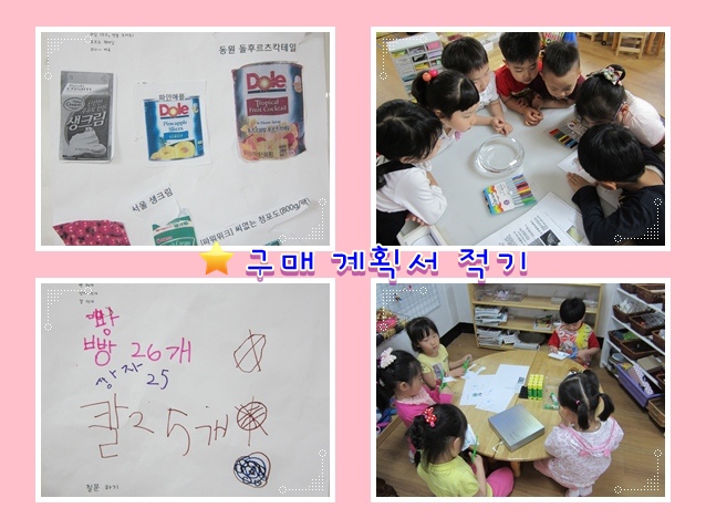 먼저 구매 계획서를 적고 필요한 재료를 구입해 보는 경험을 통해 경제교육까지 함께해 봅니다. 재료 구입을 위해 <빵집> 팀과 <마트> 팀으로 나눕니다.
