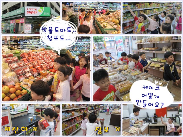 초롱초롱 눈망울로 이야기에 귀를 기울입니다. 이날 우리는 직접 빵을 사지않고 필요한 빵의 개수와 크기를 이야기하고 주문을 하였습니다. 빵을 담아갈 상자도 주문하구요. <마트 팀>마트에 도착한 우리는 다양한 코너가 있음을 알았답니다.고기 파는 곳, 생선 파는 곳, 과자쿠키, 통조림 코너까지.. 우리가 필요한 방울토마토와 청포도는 어느 코너에 있을까요?