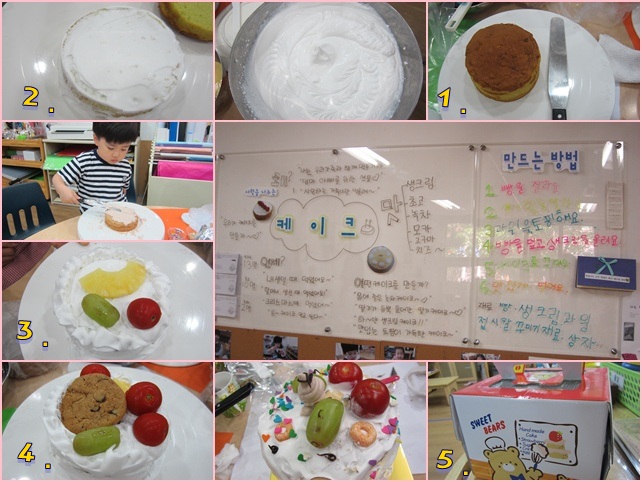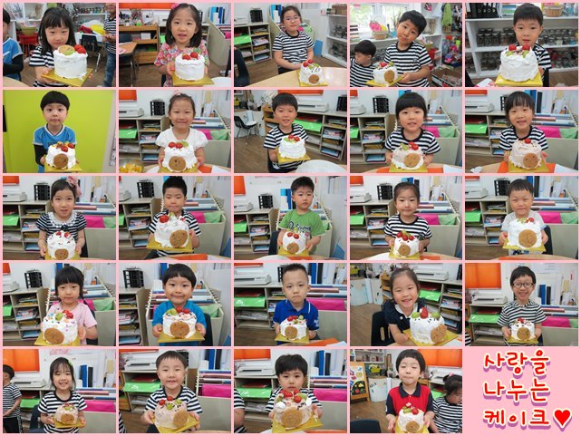 우리가 만든 순서대로 맛있는 케이크를 만들어 봅니다. 각자가 맡은 역할을 잘 수행해 내고 우리 가족을 위한 케이크를 만드는 경험을 통해 받는 기쁨보다 나누어 주는 기쁨은 두 배로 기쁘다는 것을 경험하였답니다. 새싹반 아이들이 사랑과 정성으로 만든 케이크 맛있게 드셨나요?