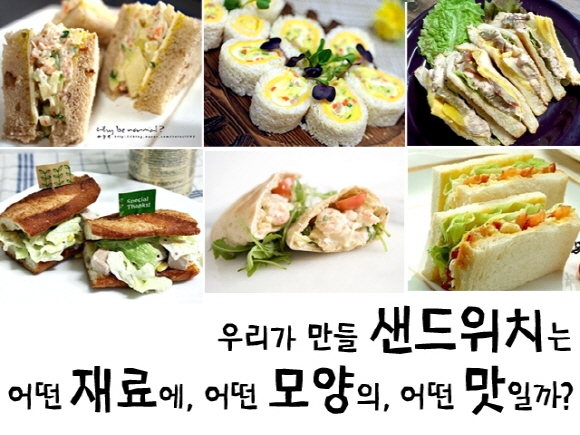 이제 어떤 요리를 만들지 고민합니다. 요리를 고를 때는 어린이들이 세 가지를 고려하여 결정하도록 하였는데요. - 첫째. 집에 가지고 갈 수 있는 요리인가? - 둘째. 우리가 직접 만들 수 있는 요리인가? - 셋째. 건강한 음식인가? 입니다. 어린이들은 세 번째 항목을 중요하게 생각하였는데요. “김치찌개!” “소갈비. 우리 아빠가 그거 좋아해요.” “자장면. 맛있어요.”를 외치던 어린이들은 집으로 가지고 가기 어렵다는 것을 알게 되자, 다른 요리를 생각하기 시작합니다. “샌드위치는 어때요?” “야채가 있으니까 건강한 음식이에요.” “그리고 맛있어요.” 어린이들이 새롭게 생각한 것은 바로 <샌드위치>랍니다. 어린이들의 특별한 샌드위치는 어떤 모습일지 기대해 주세요. 그리고 어린이들의 표현하고 싶은 마음은 한우 소갈비를 드리는 것만큼 크다는 것도 알아주세요^^