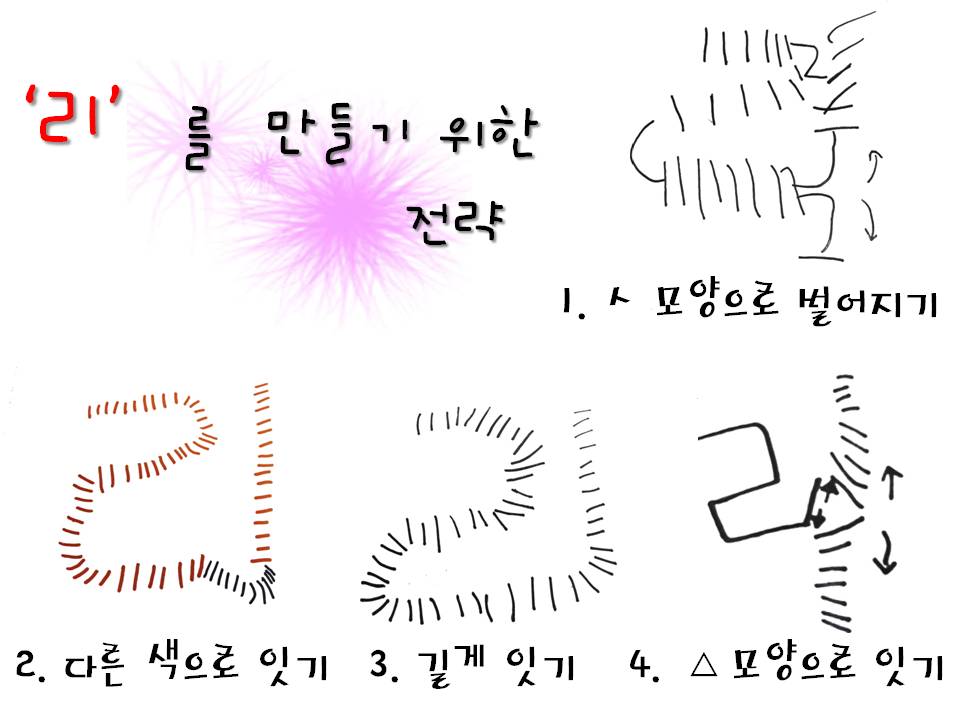 1. ㄹ과 ㅣ가 만나는 지점에서 시옷(ㅅ)모양으로 벌어지기.