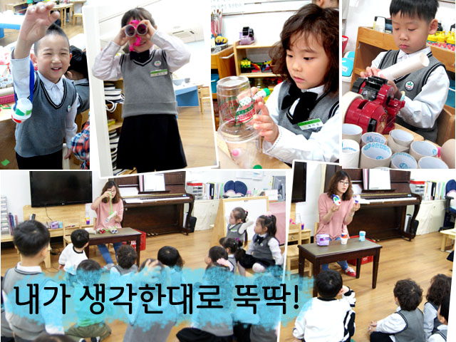 재활용품은 겉으로 보기에는 분리해야 할 쓰레기에 지나지 않지만, 조형영역에 있다면 그 무엇보다 변화무쌍한 매체가 됩니다. 어린이들은 동그란 원통 모양의 휴지심을 다양하게 변화시킵니다. “이것 보세요. 난 망원경을 만들 거예요!” “난 지팡이를 만들 거야.” 또 요거트 통은 여러 곡식과 만나 훌륭한 마라카스로 재탄생됩니다. 각자 모양도 소리도 다른 마라카스. 어린이들은 자기가 만든 작품을 친구들에게 소개 시켜줍니다. “이 소리는 파도 소리 같아.” “그건 아까 것보다 소리가 더 크네~” “친구가 색종이로 꾸며줘서 더 좋은 것 같아.” 그리고 친구의 작품 소개를 들은 어린이들은 작품에 대한 자신의 생각을 더해줍니다. 이렇게 생각들이 더해질수록 꽃잎반 어린이들의 아이디어가 더 풍성해질 것 같습니다.