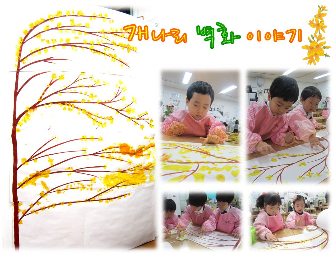 씨앗심는 순서를 회상하며 화분에 흙을 담고 구멍을 뚫은 후 씨앗을 심어 봅니다. 그리고 씨앗 위에 흙을 덮으며 씨앗에게 하고 싶은 말을 건넵니다. “씨앗아, 쑥쑥 자라.”, “빨리 자라서 예쁜 꽃이 되면 좋겠어.” 지금은 손톱보다 작은 씨앗 이지만 어린이들의 관심과 사랑으로 꽃씨는 싹을 틔우고 예쁜 꽃을 피우게 되겠죠? 씨앗을 심고 가꾸는 과정을 통해 잎새반 어린이들이 기다림의 미덕과 돌봄의 가치를 배워 나가길 바래 봅니다.<개나리 벽화>