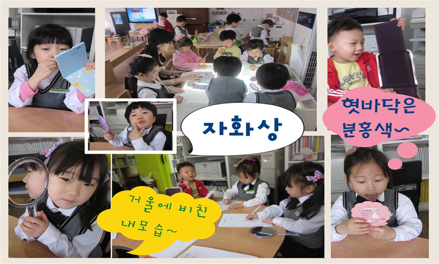 “모두 다른 사람 같아~머리 색깔도 다르고 수염도 다르니까~” 명화 속 화가의 자화상이 시간이 지나면서 다양한 모습으로 보일 수 있음도 알게 되었답니다. 명화에 대한 다양한 나의 생각을 이야기 나눈 후, 거울을 보며 나를 탐색해 보는 시간을 가져봅니다. “눈썹은 보들보들한 것 같아.” “고구마 같은 느낌이야.!” "눈에는 흰색과 검정색이 있어." "콧구멍은 세모랑 콩 모양 같아." "입술은 빨간색도 있고 연한 분홍색도 있어." “입에는 줄무늬도 있어.” 거울에 비친 내 모습을 보며 내 얼굴과 몸에 관심을 가지고 나의 정체성을 생각하게 되는 계기가 되었답니다. 나에 대한 긍정적인 생각을 갖게 되는 어린이는 다른 사람을 배려하는 마음도 함께 생기게 된답니다.#. 자연을 만나요.