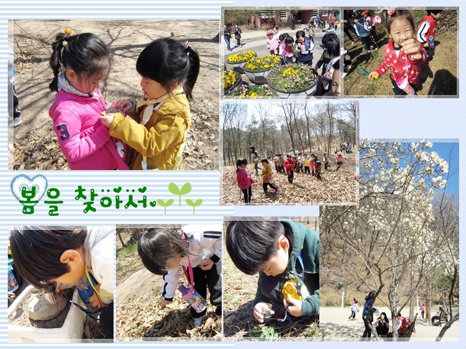 한참을 봄을 찾던 아이들에게 봄 나물 <쑥> 찾기 미션을 제공합니다. “쑥???” “쑥이 어떤 거지?” “아~나 쑥떡 먹어본 적 있어.” “나는 쑥국 먹어봤어.” 쑥을 찾기 위해 사진을 제공하고 아이들은 쑥을 찾아 나섭니다. “쑥 찾았어요~” “쑥이 보송보송해요.” “쑥을 빻으니까 냄새가 더 진해져~” 아쉬움을 남기고 유치원으로 돌아오며 숲에게 인사합니다. "숲아 안녕~"