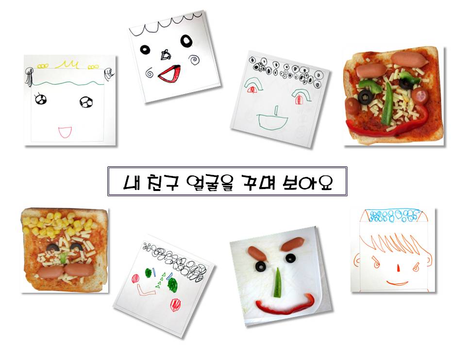파프리카, 올리브, 옥수수 콘, 소시지로 친구 얼굴을 꾸미는 여러 방법들에 대해서 이야기 나누며 내가 꾸밀 짝꿍의 얼굴에 대해서 상상하고 그림으로 표현해 보았습니다.