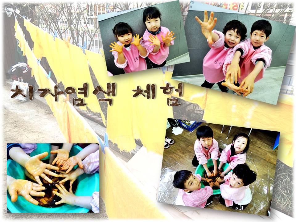 전통염색 체험은 우리나라의 전통 문화를 직접적으로 체험하며 우리 전통의 미를 감상할 수 있는 계기가 됩니다. 또한 천을 묶는 방법에 따라 어떤 무늬가 나타날지 예측해보고 실험해봄으로써 과학적 탐구 능력을 기를 수 있습니다. 아이들과 함께 치자 열매를 탐색해보고, 내가 원하는 대로 천을 구겨 고무줄로 칭칭 동여매보고, 원장님과 함께 염색체험을 해봅니다.