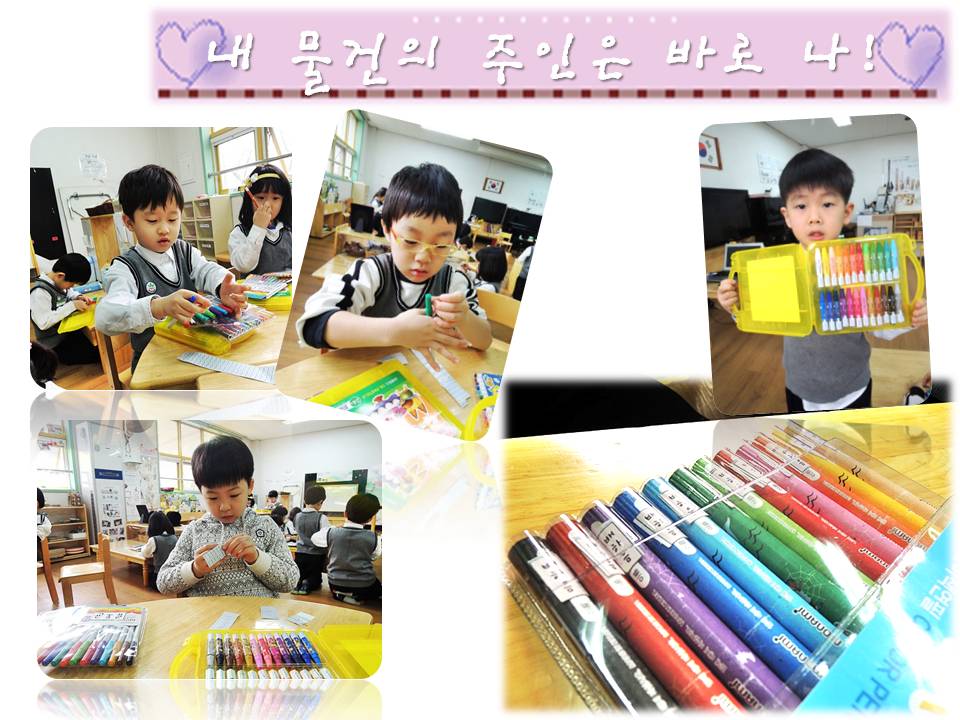 새 학기, 새로운 반에서 아이들은 새로운 나의 물건을 갖게 됩니다. 연필, 사인펜, 색연필 등 나의 물건을 확인하고 스스로 챙기는 일은 아이들에게 새 교실에서 맞는 새로운 마음가짐을 다지게 합니다. 스스로 내 이름을 찾아 내 물건에 이름을 붙이고, 물건을 챙기면서 아이들은 뿌듯함을 느낍니다.