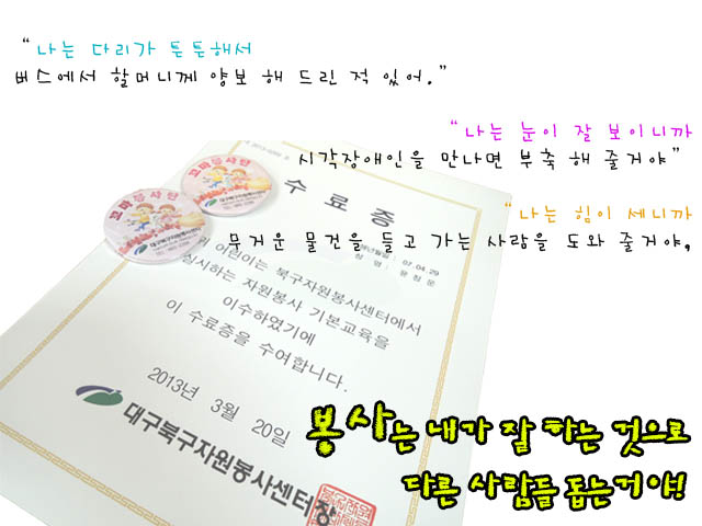 <봉사>의 의미를 알아가며 지금까지 내가 했던 행동을 돌아보고 앞으로 내가 다른 사람을 위해 어떤 것을 할 수 있을지 생각 해 볼 수 있었습니다.