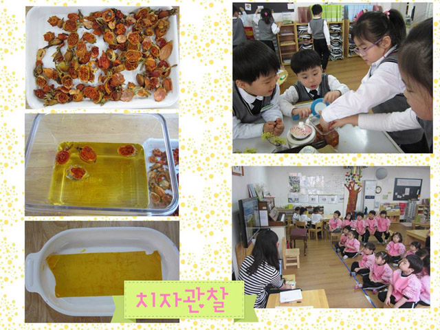 “치자가 물에서 녹고 있어” “점점 노란색이 되고 있어~” “점점 주황색처럼 변하고 있어.” 치자에 흰 종이를 넣어 변화를 관찰해 봅니다.
