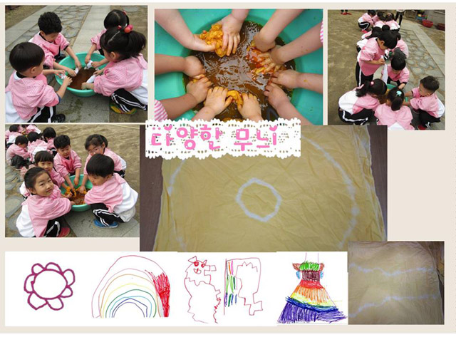 “햇빛이 반사되어 여러 가지 색깔로 보이는 거에요.” “빨간색 옷은 빨간색이 반사되어서 빨간색으로 보이는 거에요.”“양털을 깎아서 색깔을 입히나?” “물감으로 색을 칠하나봐~” 아이들과 이야기를 나누고 천연재료인 <치자열매>로도 염색을 할 수 있음을 알게 됩니다.