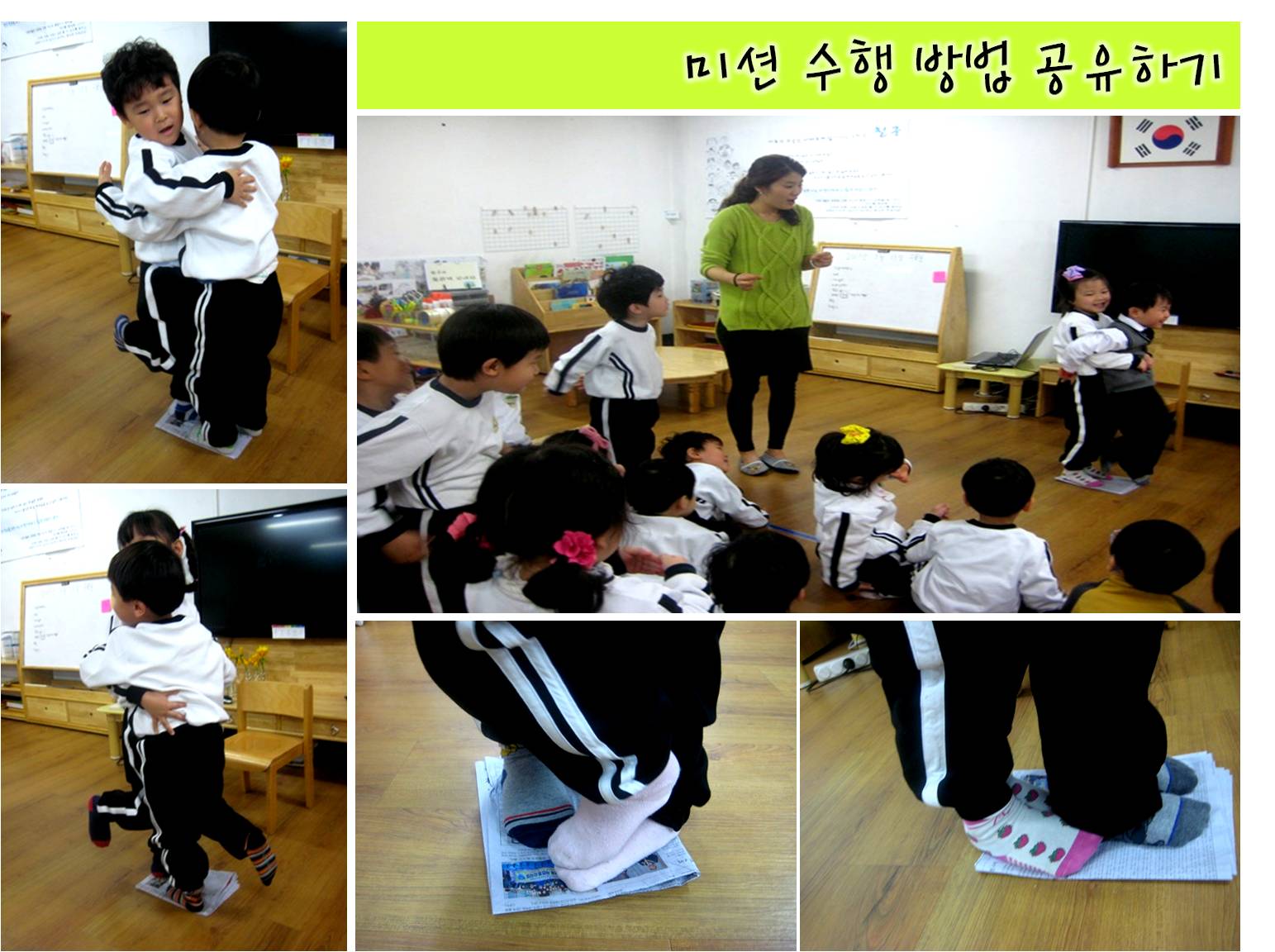 “내 발 위에 친구의 발을 올려서 성공했어요!”
