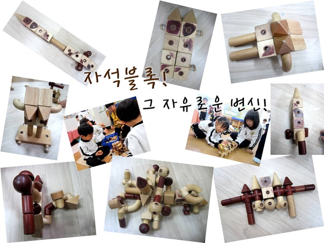 잎새반 쌓기영역에는 다양한 블록들이 있습니다. 다양한 블록은 친구들이 가상의 세계로 들어갈 수 있는 무궁무진한 상상력을 제공해 줍니다. 특히 자석블록은 자석의 성질로 인해 쉽게 모양을 변형할 수 있어 친구들에게 인기가 많답니다.