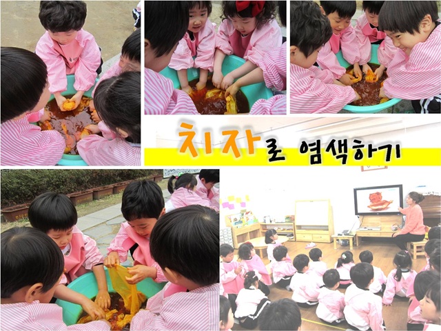 우리 주변에는 예쁜 색을 가져올 수 있는 재료들이 많이 있습니다. 오늘은 자연에서 가져온 색으로 예쁘게 물들이는 작업을 계획해 보았습니다. 염색을 하기 전 오늘의 염색재료인 치자 열매를 탐색해 봅니다. “복숭아 씨 같이 생겼어요.” “물에 넣으면 주황색 물이 될 것 같아요.” “열매가 갈색이니까 갈색물이 될 것 같아요.” 염색 방법을 알아본 후 손수건을 고무줄로 묶어 치자 물에 염색을 해 봅니다. “와~! 치자를 삶은 물이 예쁜 노란색으로 변했어요!” “손수건이 노랗게 변하는 게 신기해요!" “손수건을 주무르고 있으니까 엄마가 꼭 빨래하는 것 같아요.” “손수건이 어떤 무늬로 나올지 너무 궁금해요!” 치자로 염색 활동을 하며 친구들은 천연염색 과정에 관심을 갖고, 아름다운 자연의 색을 느낄 수 있었답니다.
