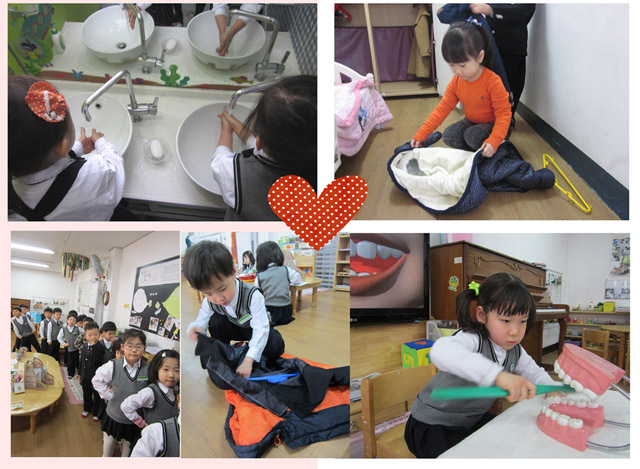 선생님이 들려주시는 옛날 이야기로 양치를 잘해야 하는 이유를 알아보고 모형을 이용해 윗니 아랫니 닦는 연습도 해보고 입속 세균을 씻어내고 헹구는 연습을 해 봅니다.