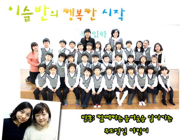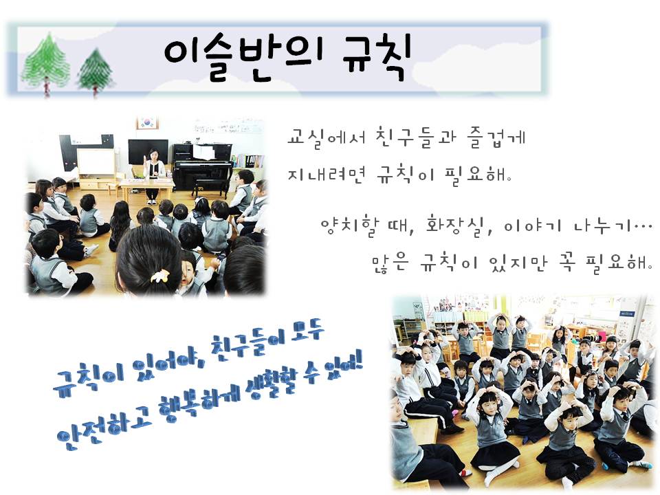 형님이 된다는 기대감과 설렘을 가지고 유치원으로 들어오는 어린들은 한껏 들떠 있는 모습입니다. “어! 너도 이슬반이야?” “형님은 2층에 가서 더 좋아요” “아~심장이 쿵쿵 거린다.” 함께 모여 서로의 눈으로 친구의 얼굴을 익히고 서로의 이름을 물어보며 이슬반이라는 울타리 안에서의 공동체 생활을 시작합니다. 7세가 되면서 어린이들은 상호작용기술의 발달, 타인에 대한관심이 높아지면서 자연스레 또래의 영향을 더 많이 받게 됩니다. 2013년도 이슬반 교사들은 어린이들이 친구와 함께여서 더욱 행복하고 서로를 배려하며 몸과 마음이 좀 더 성숙한 어린이들로 자라도록 격려하려합니다. 행복한 이슬반의 시작을 응원 해 주세요!^^#. 배려를 위한 규칙