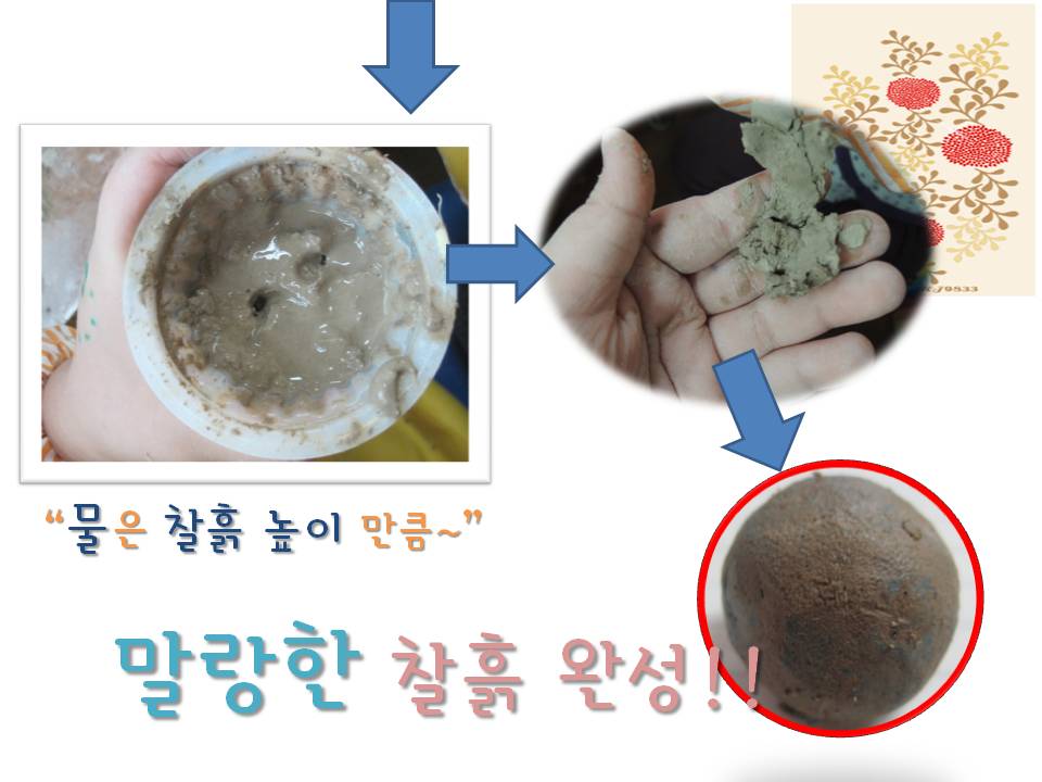 “우와~~ 드디어 찰흙이 되었어!” “우리가 쓰는 것 처럼 똑같은 찰흙이야~” “동그랗게 말아놔야지~”