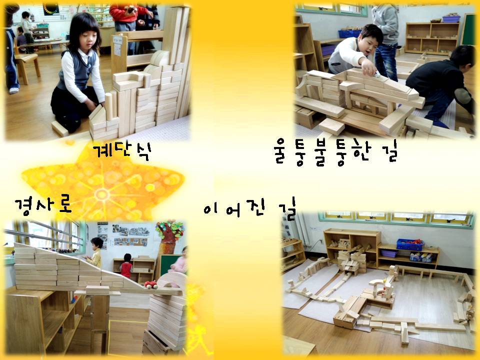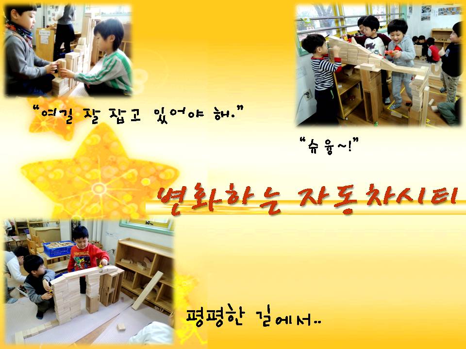 아이들이 만들고 싶어 하는 자동차시티의 다리 형태는 고가도로, 혹은 교량의 형태랍니다. 그러나 다리의 위치가 높아질수록 다리의 받침대가 튼튼하지 못해서, 혹은 친구들의 실수로 부서지는 일도 잦아집니다. “야아!! 너 때문에 부서졌잖아.” “거기 있는 줄 모르고 그랬다.” “아, 할 수 없다. 괜찮다 다시 만들자.”
