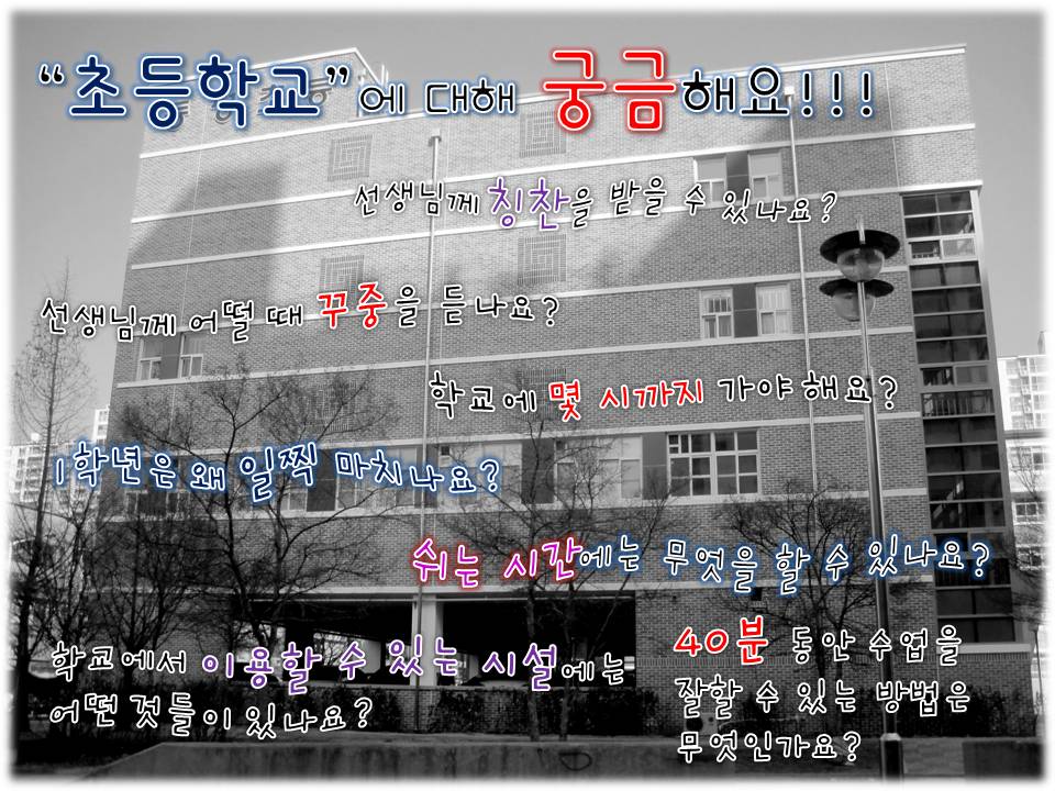 학교에 대해 궁금한 점을 초등학생 형님과 선생님께 질문해 보았습니다. 질문:학교에 몇 시까지 가야해요? 늦게 오면 복도에 나가야 해요? 답변:8시 30분까지 와야 해요. 늦게 온다고 해서 복도에 나가지는 않지만 자꾸 늦게 오는 습관을 가지면 게으름뱅이가 되겠죠! 질문:선생님께 어떻게 하면 칭찬을 받을 수 있나요? 답변:학교 규칙을 잘 지키고 선생님의 말씀을 잘 듣는 친구들은 칭찬을 받을 수 있어요! 초등학교 형님과 선생님을 통해 친구들은 초등학교에 대한 궁금증을 해결할 수 있었답니다.