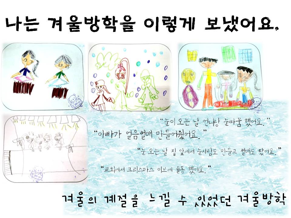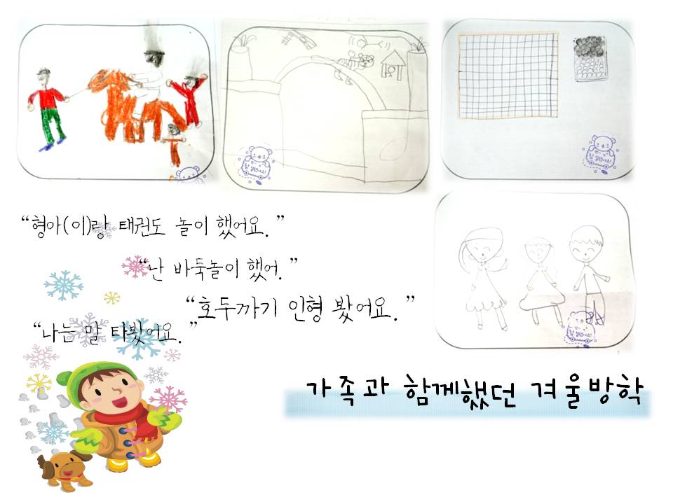 “저는 방학동안 친구 집에서 딱지치기를 했어요.” “저는 엄마아빠 동생이랑 할머니 집에 가서 얼음 위에서 눈썰매를 탔습니다.” “저는 놀이동산 갔어요.”“방학동안 동생이랑 집에서 책을 읽었어요. 내가 동생한테 (책을)읽어줬어요.”
