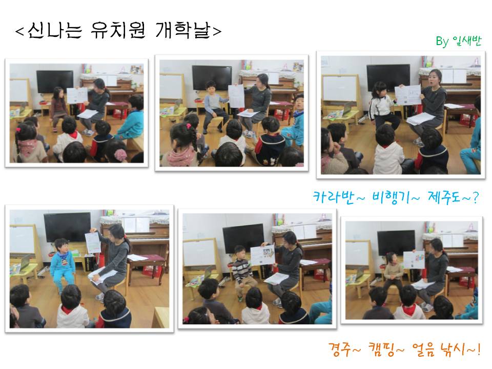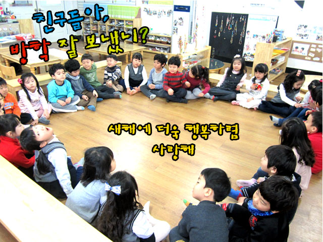 앞에 나와 발표하는 친구들은 자신있는 또렷한 목소리로 바르게 말하며, 앉아서 친구의 이야기를 듣는 친구들은 바른 자세로 앉아 친구의 이야기를 경청합니다. 새로운 한해가 시작되고, 멋진 형님이 된 잎새반에는 또 어떤 재미있는 일들이 기다리고 있을까요?방학기간에도 좀 더 알차고 부지런한 시간을 보내기 위해 제시 된 과제<방학책> 서로 소개하고 그 중 어린이들이 가장 기대하고 있는 <우리가족이 만든 윷놀이 게임>에 대해 나누어봅니다.
