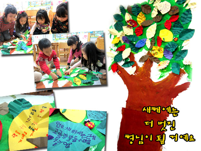 - 새해에는 레고를 잘 만들 수 있을 거 같아요. 새해가 되었다는 것이 그저 해가 바뀌었다는 것을 아는 것에서 넘어서 <한 살 더 먹어 형님이 되고 형님으로 가져야 할 마음가짐과 태도>에 대해 생각 해 볼 수 있었습니다. 어린이들이 품고 있는 작은 소망을 담아 협동하여 소망 나무를 만들고 잎을 붙여봅니다. - 나무에 달린 우리 소망이 꼭 이루어졌으면 좋겠어요. 잎새반 파이팅!!