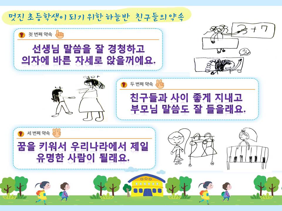 초등학교 입학을 앞둔 예비 초등학생 하늘반 친구들... 초등학교에 대한 즐거운 기대를 가지고 남은 시간 동안 초등학교에 가기 위해서 준비해야 되는 것들을 이야기 나누어 보고, 계획해 봅니다.