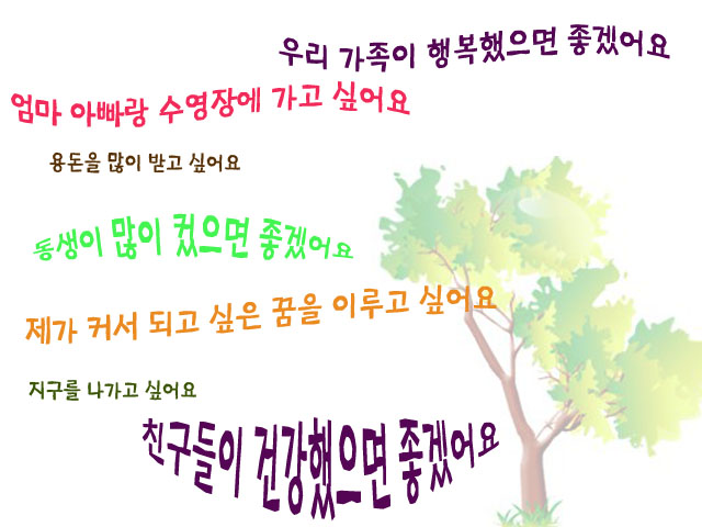 마음 속 소망을 말하는 이슬반 어린이들의 표정은 밝고 신이나 보입니다. “소원을 이루기 위해 우리는 무엇을 할 수 있을까?” “아마도 엄마, 아빠 말씀을 잘 들어야 해요. 그래야 착한 어린이라고 머도 사주시고 칭찬도 받거든요.” “가족들이 모두 밥을 열심히 먹고, 아빠는 담배도 줄이고 엄마는 운동도 많이 하고 해야지 건강할 수 있어요.” “만들기를 많이 해 볼거예요. 진짜 로봇은 아니라도 멋진 걸 만들 수 있으니까...”