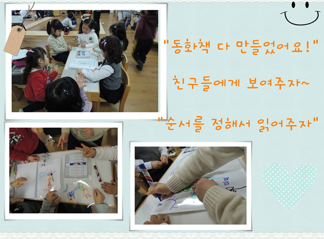놀이시간 친구들과 모여서 동화책의 내용을 생각하고 만들던 아이들이 동화책 한권을 완성합니다.