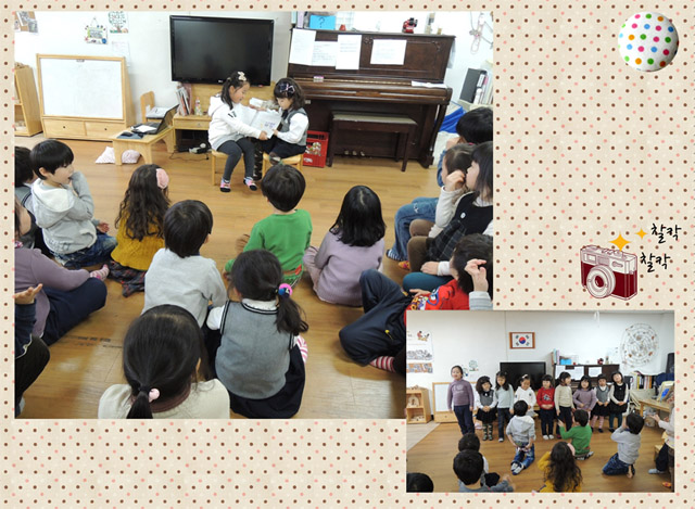 “친구들이 동화를 들려준다고 하니까 기대되요~” “무슨 내용인지 궁금해.”