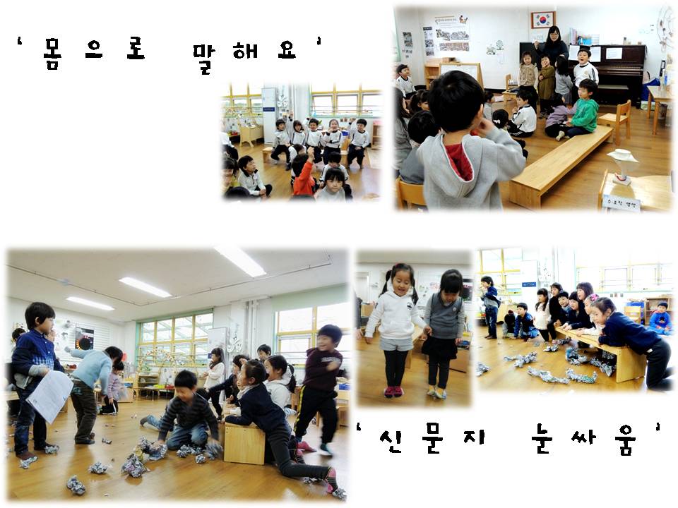 겨울에도 할 수 있는 놀이는 얼마든지 있답니다. 아이들과 함께 규칙을 정한 후, 겨울하면 생각나는 것들을 주제로 한 신체표현을 해봅니다.
