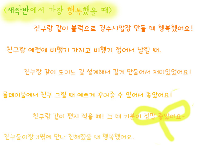 “유치원에서 3월에 00이를 만났을 때 행복했어요!”, “맨 처음에 00랑 같이 놀면서 친해졌을 때요.”, “아빠랑 같이 손잡고 유치원에 와서 주먹밥 만들었을 때 행복했어요.”, “친구랑 같이 경주시합하면서 놀았을 때가 좋았어요.”, “친구랑 같이 만들기 할 때요. 그리고 도미노도 같이 할 때 행복했어요.”, “00이랑 같이 편지 쓸 때요!”, “친구랑 예전에 비행기 가지고 비행기 접어서 날릴 때 좋았어요!” 새싹반 친구들은 소소했던 일상 속에서 행복하고 즐거운 추억들을 가슴 속에 담아가고 있었습니다. 그 중에서도 친구와의 만남에 대한 이야기를 나누는 모습을 통해 친구의 소중함에 대해서도 다시 한 번 생각할 수 있었던 시간이었답니다.