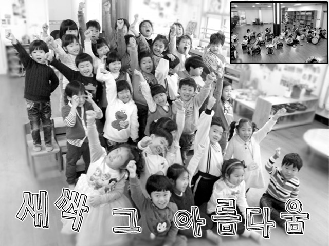 우리의 또 다른 추억거리가 될 음악회를 앞두고 새싹반에서는 준비가 한창입니다. 1년 동안 국악 시간에 익힌 장단들을 다시 한 번 되돌아보고 연습하니 어느 덧 그럴듯한 사물놀이가 되어가고 있습니다. 처음엔 장단을 익히는 것조차 어려운 일이었는데 이제는 장단을 이어 연주할 수 있으니 어린이들이 정말 대단한 것 같습니다. 그와 더불어 함께 부르는 합창곡 역시 나날이 그 실력이 늘어갑니다. 장구, 북, 징, 꽹과리 이 네가지 악기로 어린이들이 만들어 내는 소리와 한마음으로 내는 합창은 비록 실수가 있다할지라도 너무나 훌륭합니다. 이는 완벽하지 않지만 어린이들이 저마다 자신의 악기로 자신의 위치에서 내는 각자의 소리가 모여 하나가 되기 때문입니다. 긴장되지만 물러서지 않고, 실수하더라도 다시 시작할 수 있으며, 지치더라도 결코 포기하지 않는 끈기를 알아가는 어린이들이 자랑스럽고 대견스럽습니다. 12월 14일. 무대에서 최선으로 그 감동을 전해줄 새싹반 어린이들에게 아낌없는 격려와 응원 부탁드립니다.^^