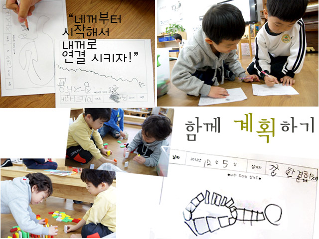 어린이들은 친구와 함께 구성할 도미노의 설계도를 같이 계획합니다. “우리 안경모양 만들자!” “니 설계도랑 내 설계도를 합쳐서 이어지게 하자!” 친구와 함께 이야기를 나누며 계획하지만 계획한 도미노를 만들기에는 아직 많은 어려움이 있습니다. 왜냐하면 도미노의 예상경로나 출발점, 또 구체적인 도미노의 형태, 크기 등을 이야기 하지 않기 때문입니다. 그러나 친구와 만들기를 좋아하는 어린이들. 계속적인 어린이들의 놀이 속에서 친구와 함께 하나의 도미노 만들기를 계획하는 것을 배워가지 않을까 기대해 봅니다.