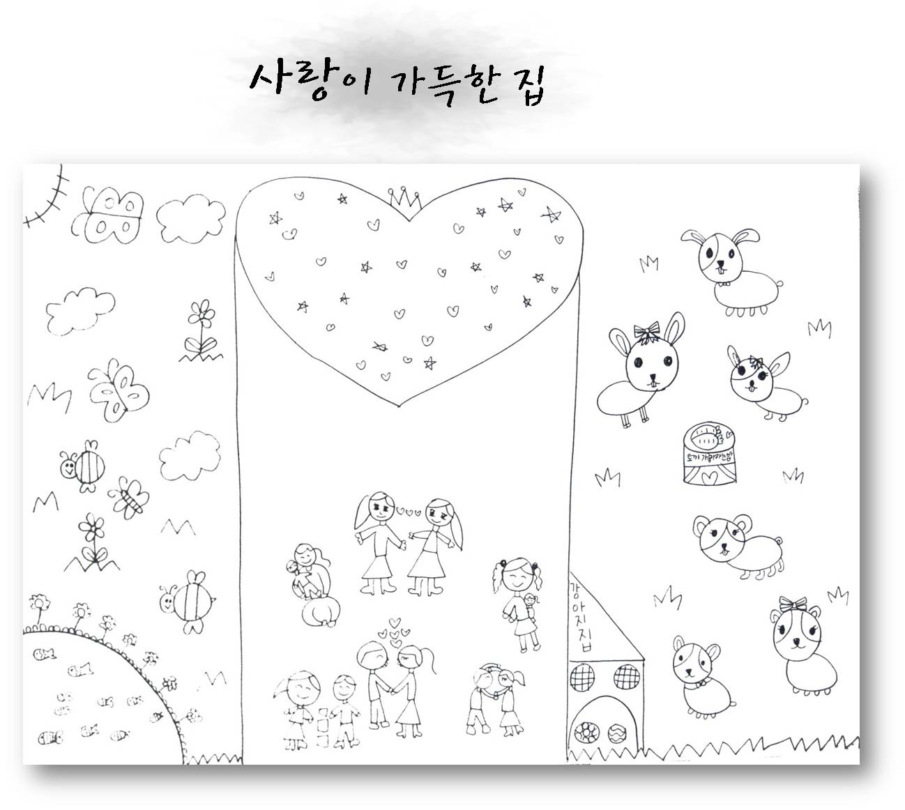 "사랑이 가득한 집이 되려면 집에 있는 사람들이 행복해야 해!" “서로가 좋아하는 마음이 있으면 사랑이 가득한 집을 만들 수 있어. 그런데 좋아하는 마음은 표현해야지 알 수 있어. 업어주고, 안아주고, 도와주고, 뽀뽀해 주는 것처럼 말이야.” “귀여운 동물들과 함께 살면 사랑이 더 넘쳐나게 될 거야. 그런 집에 살면 동물들도 행복하겠지?” “이런 집에 있다면 하트가 마구 생겨나는 기분이 들 것 같아.”