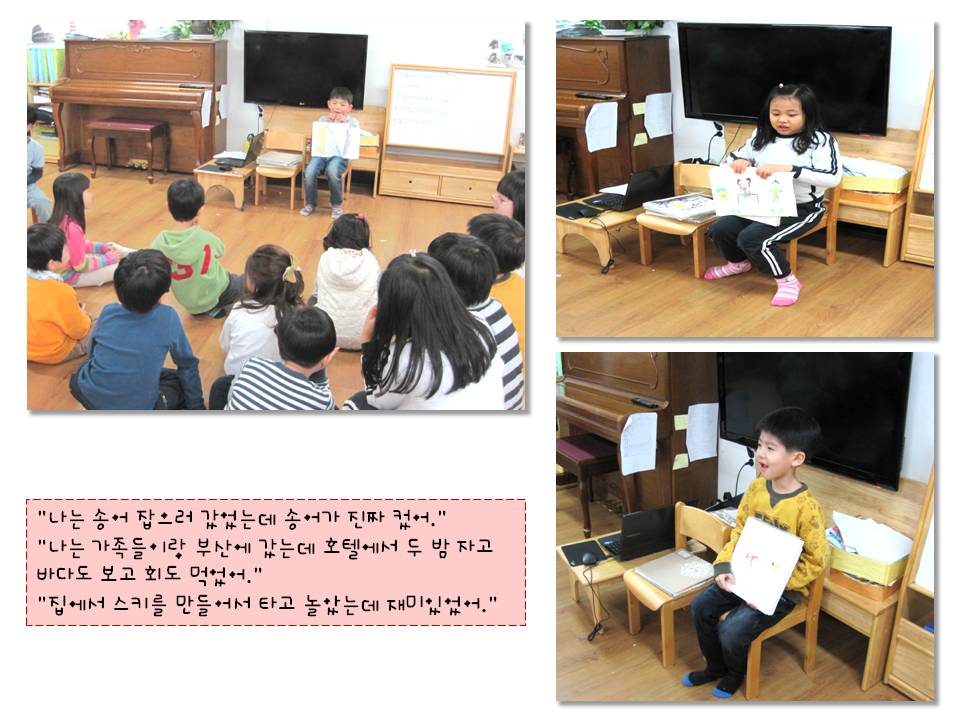 이슬반 친구들은 저마다 겨울방학을 보내면서 가장 기억에 남는 일을 그림으로 그리고 글로 쓰고 친구들 앞에서 발표도 하였답니다.