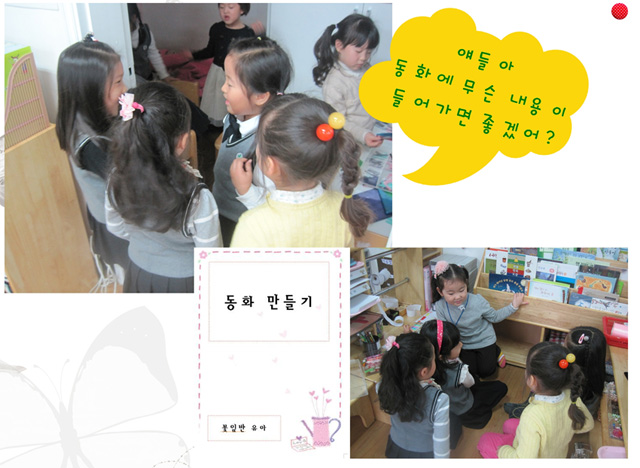 “빨간 모자처럼 나오는 걸로 해서 동화를 지어보면.. (좋겠어.)” “소녀가 꽃을 보면서 놀고 있는 걸로 하면 좋겠다.”