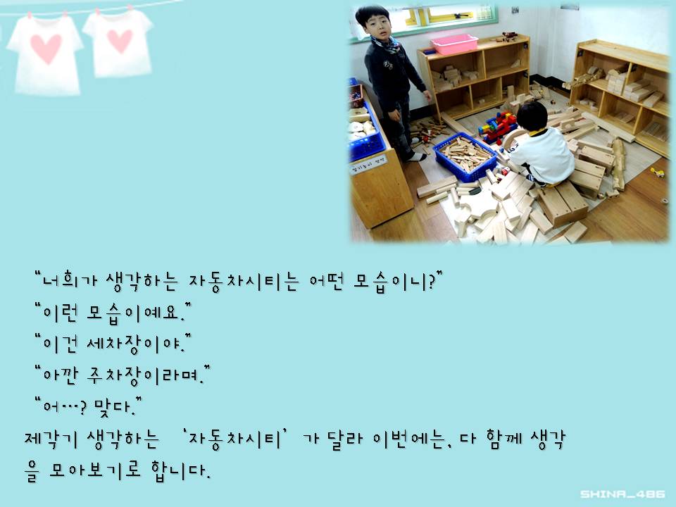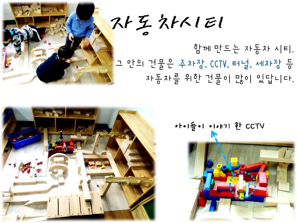 그런데 아이들은 작품을 보면서 친구들의 설명을 듣지 않으면 자동차시티의 어떤 건물이 무슨 역할을 하는지 알지 못합니다. 친구들이 묻지 않아도 작품을 보고 우리의 자동차시티를 소개하는 방법은 없을까요?“종이에 (이 건물이)뭔지 써서 벽에 붙여두면 좋겠어.”