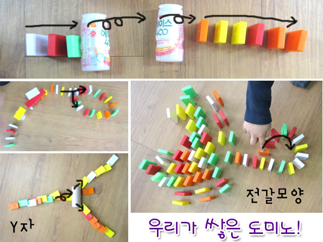 “같이 도미노를 만들어 보니 어땠어요?” “혼자 하는 것 보다 재미있었어요.” “친구랑 만드니까 혼자 만들 때 보다 더 길게 만들 수 있었어요.” “그리고 더 크게! 더 멋지게”