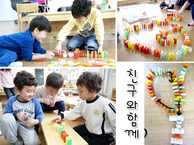 어린이들은 같이 도미노를 만들고 무너뜨리며 함께 기뻐합니다.어린이들이 함께 하는 도미노는 아직 공동의 계획이 이루어지지는 않고 말 그대로 각자의 도미노가 그냥 합쳐지는 정도의 놀이입니다. 그러나 어린이들의 이러한 놀이는 굉장히 의미롭게 생각됩니다. 왜냐하면 함께 하는 기쁨을 알았기에 이제는 같이 하는 일이 더 많아 질 것이고 이렇게 같이 구성하는 일이 계속되면 후에는 친구와 함께 협력하고 의논하여 계획하는 것도 가능하지 않을까 기대되기 때문입니다.