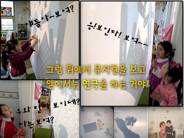 OHP위에 매체를 올려 구성하는 놀이를 즐기던 새싹반 어린이들은 스크린에 비치는 배경에 맞는 행동, 몸짓(천을 올린 후 “그물에 걸렸어!”, 집을 구성한 후 “소풍가자~~” 등)을 합니다. 그러면서 어린이들은 자연스럽게 그림자 극놀이를 시작하게 됩니다.
