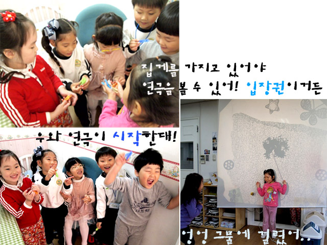 어린이들은 스크린 앞, 뒤로 매체를 올려 어떻게 비치는지 확인 후 빛이 없는 스크린 뒤에서는 관람을 하고, 빛이 있는 스크린 앞에서는 연극을 하기로 합니다. 이렇게 해서 어린이들은 지금껏 본 극 경험을 생각하며 나름대로의 극을 진행합니다. 그러나 배경과 어울리는 이야기긴 하지만 아직은 이야기의 연결이 부자연스러운 부분이 많았으며 관람하는 사람들도 잘 들리지 않고, 이해가 안 된다며 이야기를 합니다. 이렇게 이야기 전개를 계획하지 않고 시작한 어린이들의 극 놀이는 금방 끝나버립니다.