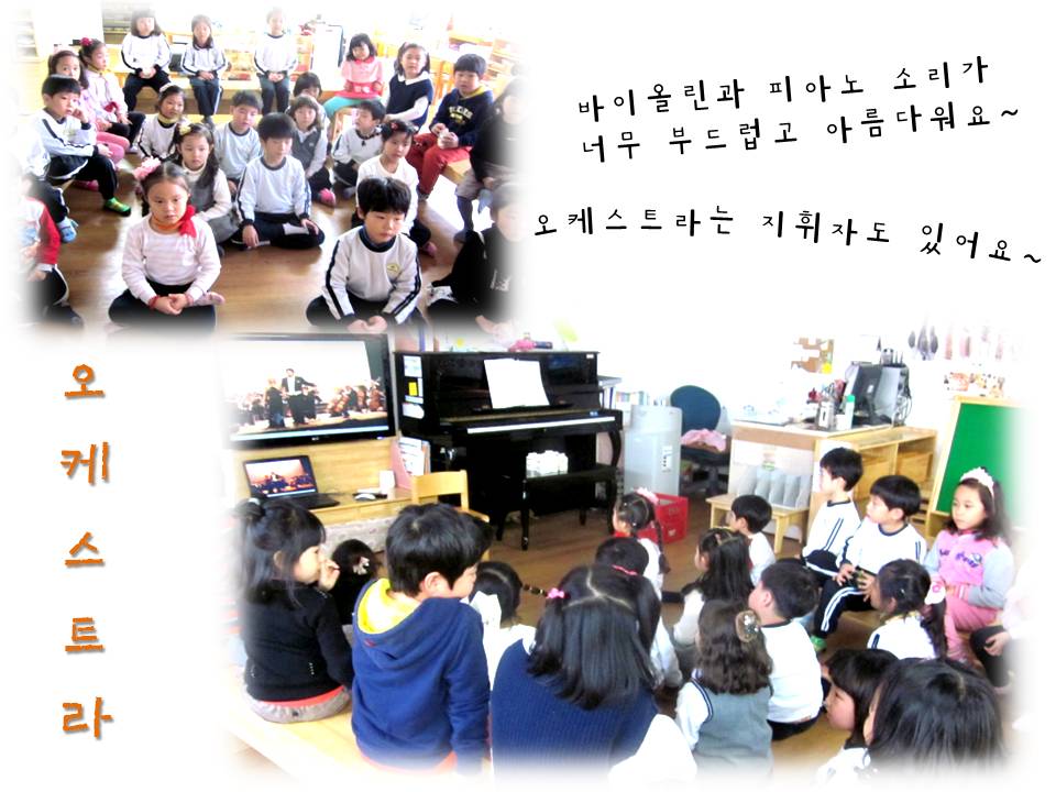 다양한 장르의 공연 감상을 통해 난타, 오케스트라, 리듬합주의 고유한 특색을 이해하고 ‘리듬’이라는 음악적 요소와 음악의 아름다움을 이해할 수 있었답니다. 유아들이 만들어 가는 공연이야기... 다음 주를 기대해봅니다.