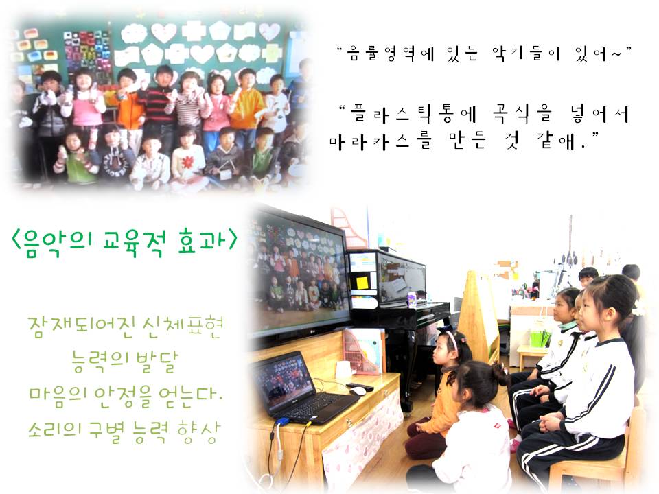 유아들의 리듬 악기 공연에 앞서 폭넓은 음악 장르를 이해하고자 오케스트라, 난타, 뉴에이지 등 다양한 음악을 감상하고 느껴보는 시간을 가져보았답니다.