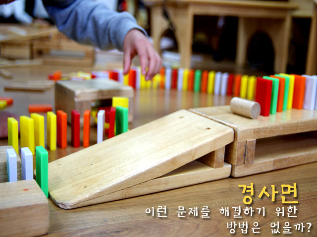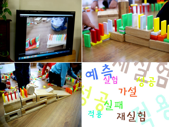 “정확히 맞춰지는 않는 건 여러 개를 사용해서 해결해요. 맞추는 도미노는 한 개지만 맞춰지는 건 세 개쯤 해서 그 중에 하나만 맞아도 다시 시작하는 도미노가 되는 거예요.” “미끄러지지 않는 건...침을 뭍여서(웃음)하거나 휴지로 싹싹 닦으면 안될까요?” “아니면 굴러가는 공이나 블록으로 하면 힘도 세고 잘 되요.” “그리고 힘을 세게 하려면 이렇게 하면 되요.(경사면의 블록을 두 개 합쳐 경사각이 크게 만든다) 이렇게 하면 도미노로도 힘이 세게 미끄러지게 할 수 있어요.” (두번째 상황: 높은 곳에 놓여진 도미노에게 힘을 가할 그보다 조금 긴 카프라 블록) “이건 높이가 달라서 문제예요.” “높이? 높이가 다르면 힘이 전달되지 않니?” “조금밖에 안 닿으면 힘이 약해지니까요.” 우리반의 도전은 계속 됩니다.