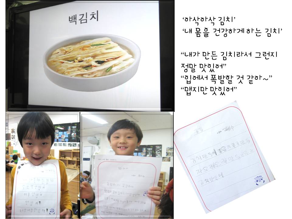 우리나라 전통 음식인 김치를 직접 담궈 보고 내가 만든 김치를 맛보기도 하고, 동시까지 지어보는 활동을 하면서 김치를 싫어하던 친구들도 김치에 관심을 가지고 먹으려고 노력하는 모습을 볼 수 있었답니다.