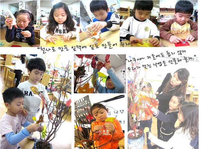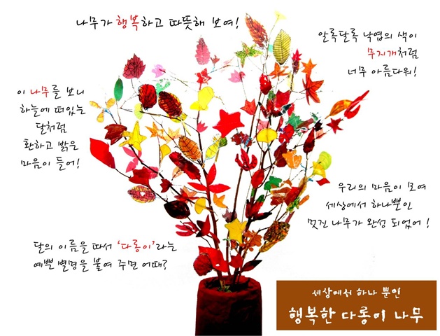 어린이들은 지금까지 표현했던 가을 낙엽들을 이용해 나무를 좀 더 풍성하고 아름답게 꾸밉니다.그리고 나무에게 전하고 싶은 메세지도 함께 전해 봅니다. “추워 보였던 나무가 이제는 따뜻해 보여.” “나무가 너무 행복해 보이는 것 같아. 이제는 알록달록 예쁜 낙엽들과 햇살반 친구들 모두가 친구가 되었으니까..." "나무는 새로운 친구들과 친하게 지내고 싶다는 생각을 할 것 같아.” “나무에게 멋진 이름도 지어주고 싶어. 나무에게 이름이 있으면 친구처럼 더 많이 불러줄 수 있을테니까!” "무지개 나무?" "세상에 하나 뿐인 나무?" "행복한 나무?" “나무를 보니까 환한 마음이 들어. 달 이름을 따서 다롱이 나무 어때? "그럼 행복한 다롱이 나무라고 이름을 지어주자!"
